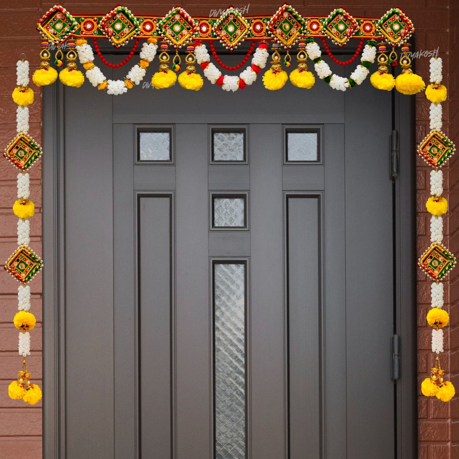 - Lightweight and easy to hang, the Ginni door garland is ideal for entrances, windows, and walls; its irregular shape and layered pieces create depth and movement when gently swayed. Perfect for Diwali, festive occasions, wedding décor, or everyday traditional styling. Each set includes multiple hanging elements and side tassels for a complete, rich look.