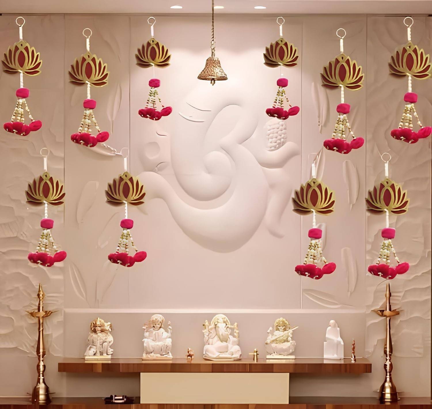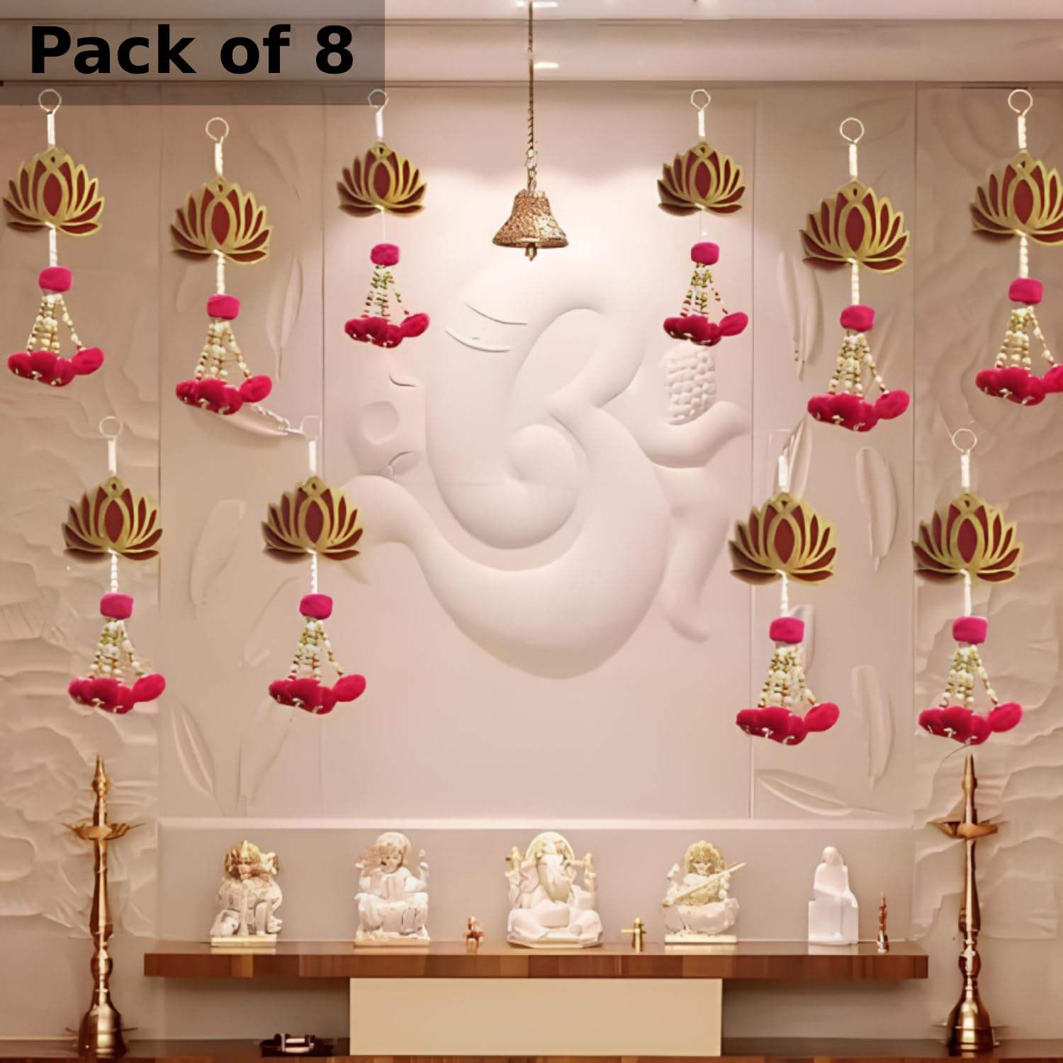 Set of 8 Pom-Pom Lotus Wall Decorative Hanging | Traditional MDF Backdrop Décor for Festivals & Home